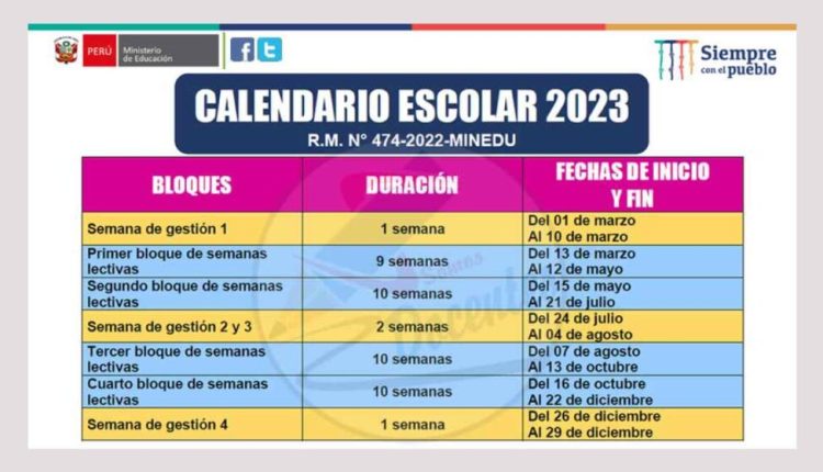 El Ministerio de Educación ha publicado un cronograma correspondiente al año escolar 2023. Esto se está dividiendo en 7 bloques desde el mes de marzo a diciembre del presente año. Así tenemos: